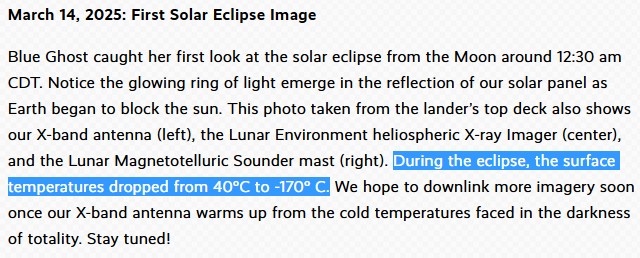L'eclisse è durata qualche ora e nel mentre la temperatura della regolite è scesa di ben 210 gradi, ma la vulgata dice che ci vogliono giorni perché il suolo si raffreddi e non le poche ore di una missione, almeno delle prime di sicuro.