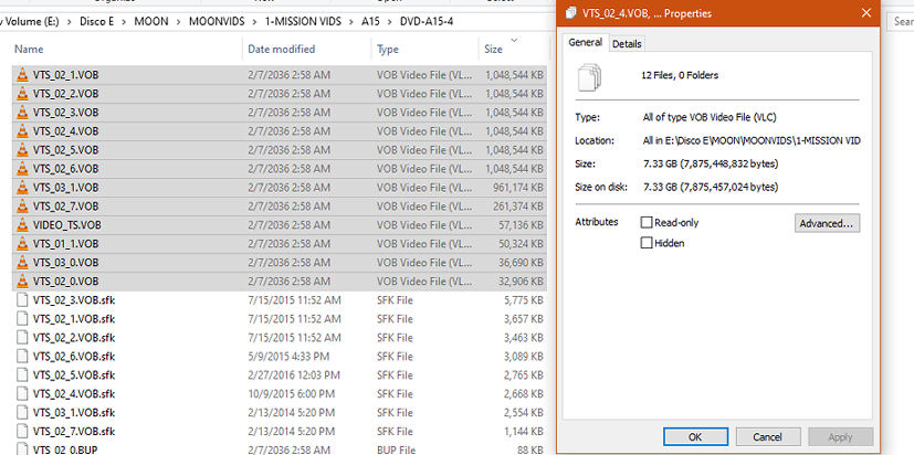 Nei DVD non esiste una dimensione specifica dei file video. I files VOB dei DVD sono tutti da 1.048.544 KB, è una misura standard in cui vengono suddivisi i filmati che stanno sul disco (finisce uno e inizia l'altro, back-to-back). Salvo l'ultimo VOB, ovviamente, che di solito è più piccolo.PIGNA: Puoi postare uno screenshot delle proprietà del CD che contiene il famigerato video di A15 e la dimensione del file video?
