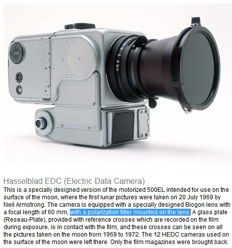 I dati a nostra disposizione per la missione Apollo 11 dovrebbero essere questi:Quindi, ragionando di quantità di luce per chi volesse farlo in merito a quanto ho detto prima sul Sunny16, a diminuirne ancora la quantità contribuiscono il Reseau-Plate (magari anche poco, eh!, ma c'è) ed anche e soprattutto, almeno per quella che è la mia esperienza, il filtro polarizzatore.