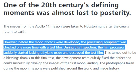 quante probabilità ci sono che il macchinario della Nasa ad Houston per lo sviluppo delle foto appena arrivate dalla Luna avesse proprio quel giorno ed in quel momento un malfunzionamento così dannatamente catastrofico???