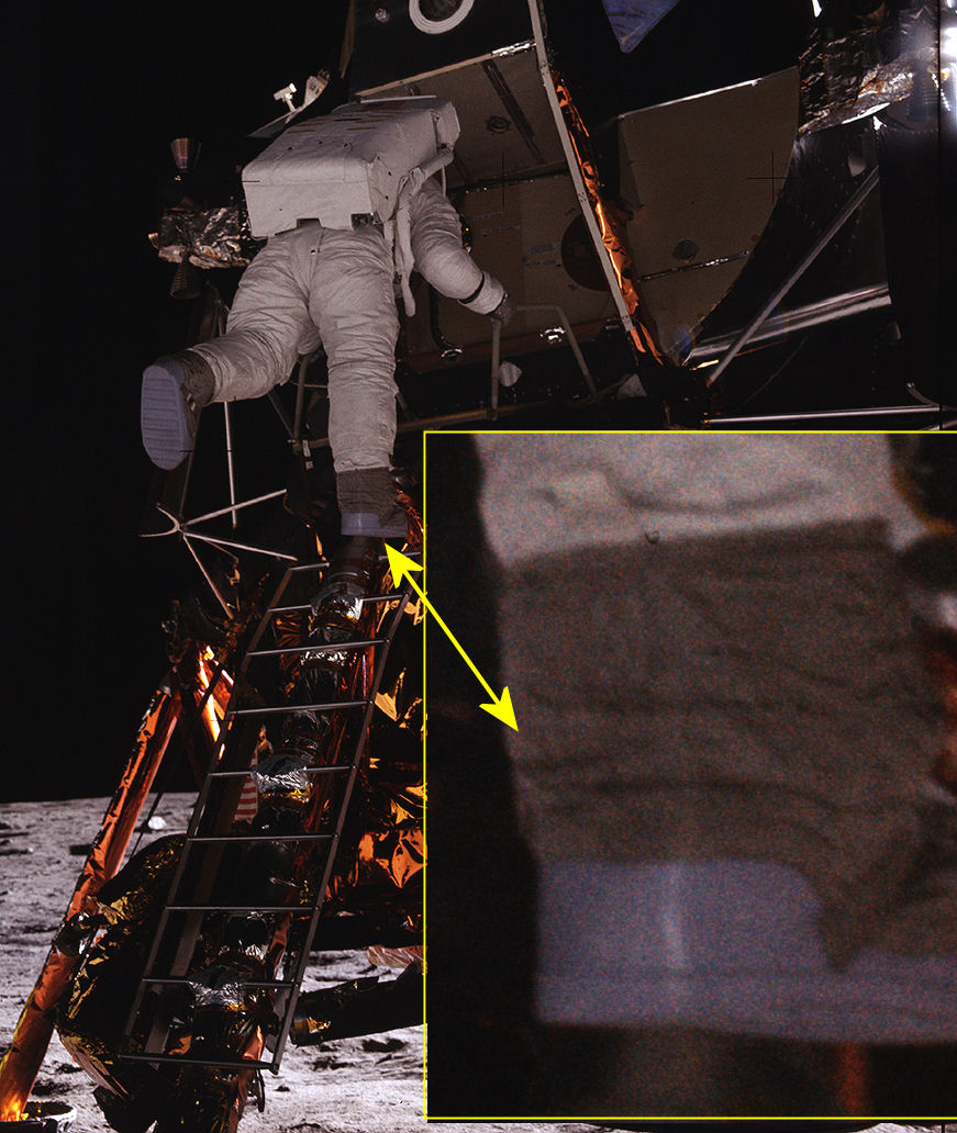 Ipotesi che io ho bocciato in pieno (sappi che io sono l'unico debunker che debunka anche i debunker) limitando la luce proveniente dalla tuta di Armstrong su Aldrin ad una luminosità minima che però giustificava almeno il debole riflesso sui tacchi e il riflesso un po' più visibile sul kapton.