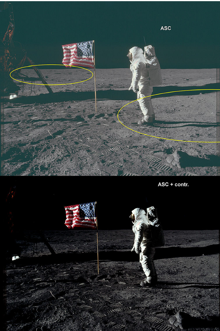 Infatti nel confronto con le foto lunari, tra la tuta e il terreno la differenza di luminosità varia moltissimo