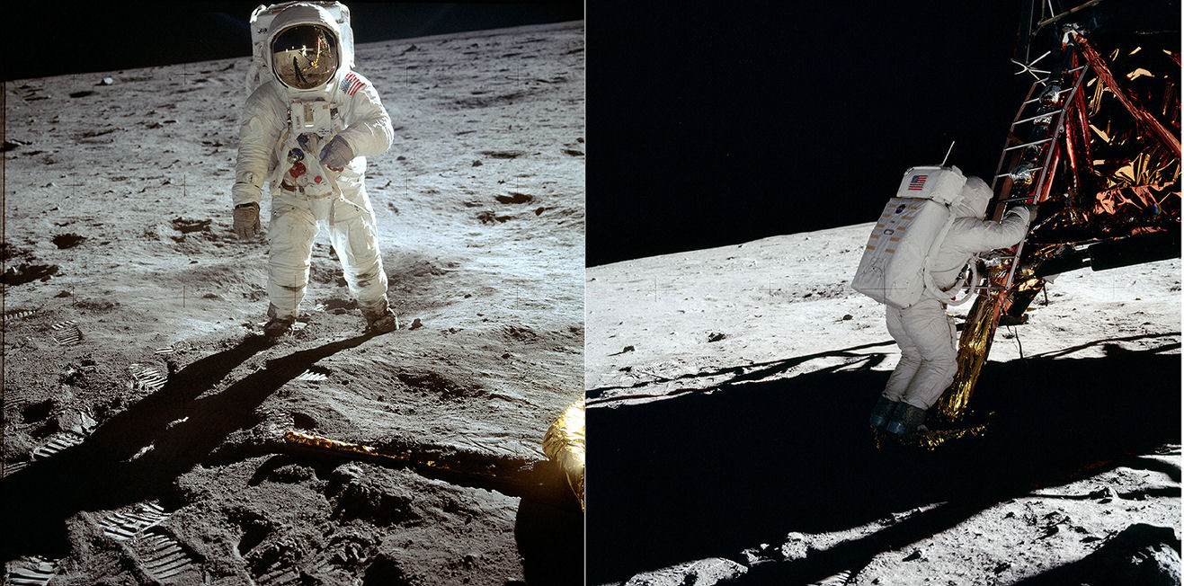 Quindi, se già la tuta di Armstrong era (correttamente) ininfluente nella foto a sx, come può influenzare la luminosità della tuta di Aldrin in quella a dx, visto che Armstrong è ancora più lontano?