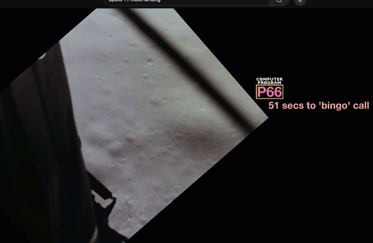 Armstrong, dal Technical Debrief del 1969 - “Ho notato per la prima volta che stavamo disturbando la polvere sulla superficie quando eravamo a meno di 100 piedi; stavamo iniziando ad avere un foglio trasparente di polvere in movimento che oscurava un po' la visibilità. Man mano che scendevamo, la visibilità continuava a diminuire. Non credo che la determinazione dell'altitudine (visiva) sia stata gravemente danneggiata da questa polvere soffiante; ma la cosa che mi ha confuso è stata la difficoltà di capire quali fossero le velocità laterali e di discesa, perché si vedeva molta polvere in movimento attraverso la quale bisognava guardare per individuare le rocce ferme e basare su di esse le decisioni sulla velocità di traslazione. Per me è stato piuttosto difficile. Ho passato più tempo a cercare di arrestare la velocità traslazionale di quanto pensassi fosse necessario".