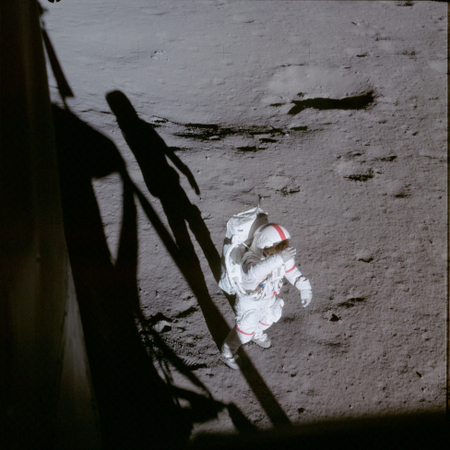 Confronto con i Lunakhod. Il confronto è difficile perché la fotocamera del lunakhod era un po' più vicina al terreno (direi intorno a 1 metro di altezza), non conosciamo la focale, né la lunghezza delle ombre, sappiamo solo che le propaggini più alte del modulo sono a 2-2,5 metri di altezza (verticale) dal suolo. Le ombre sono coerenti, più compatte, e anche le ombre sottili dell'antenna sono visibili (ultimo link). Certe sagome di astronauti a confronto sono proprio gonfie, di uno sfumato fuori scala.