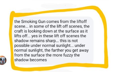 Vedi Roberto che anche il tuo complottista mi dà ragione, ha detto una cosa giustissima ossia che sotto la luce solare più ci si allontana dalla superficie, più l'ombra sarà sfuocata e per lui la smoking gun non sono le ombre sfumate, ma all'opposto quelle troppo nette!