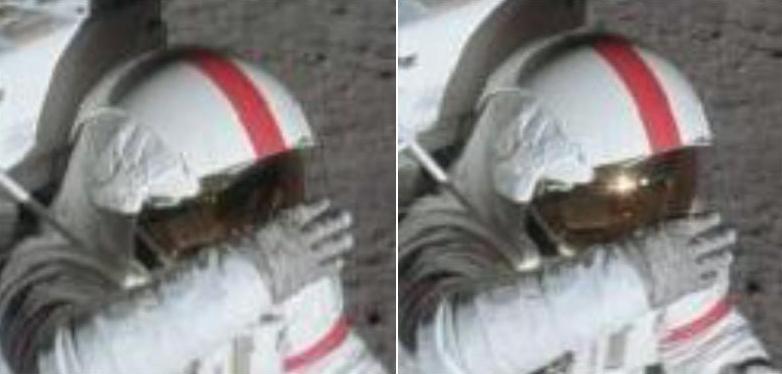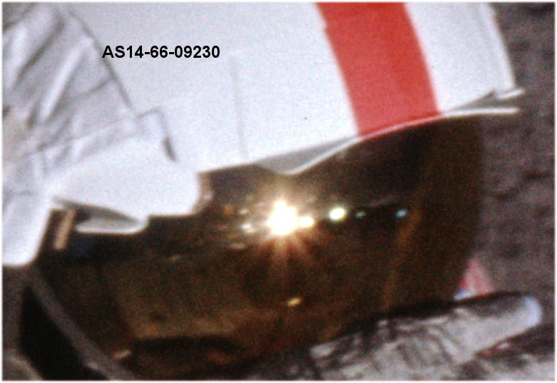 Sarà sicuramente stato un effetto lens-flare sul casco che ha ovviamente creato tutti quei pallini accanto al Sole (o alla sola...)Venusia: questo è l’ingrandimento Max-Res della foto che hai postato (dagli scan ASU)