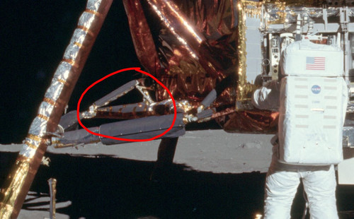 Oltretutto il Lem è sulla destra e le ombre dele zampe lo confermano, quindi quell'ombra ( opposta )non credo sia sua e se non è di Armstrong dovrebbe essere qualcosa dietro di lui ma decisamente più in alto
