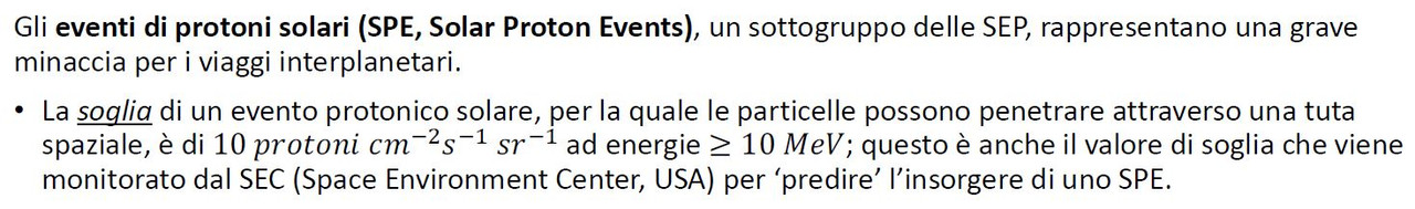 ad energie superiori o uguali a 10 Mev; questo è anche il valore di soglia che viene monitorato dal SEC (Space Environment Center, USA) per ‘predire’ l’insorgere di uno SPE.