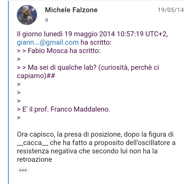 Nei vecchi forum di usenet di scienze e fisica (free.it.scienza.fisica)lo conoscono tutti, è il signor "ho detto tutto", anche lì si è fatto conoscere come tuttologo, è un famoso spara panzane, fa incazzare anche i suoi colleghi (che non sono nemmeno complottisti)