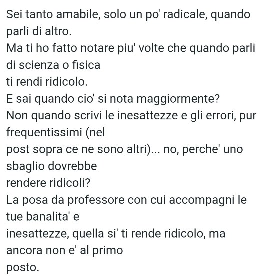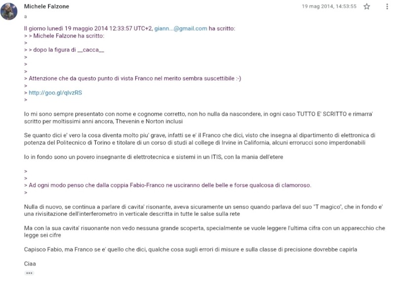 Leggetevi la discussione, capirete ancora meglio le arrampicate sugli specchi di chiaro&semplice e le sue tecniche di magia, anche se lì è un confronto alla pari dato che sono suoi colleghi, non ci scappa perché la Fisica è quella e anche se andare sul tecnico non funziona con loro.