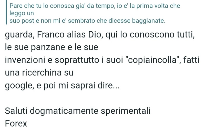 Intanto ti ringrazio per la risposta pacata e per questo non aggiungerò altri commenti di tipo tecnico, perché chi vuole capire ha abbastanza dati per approfondire con i post già scritti, e invece riprendo le parole di Charlie queste:Come dici di sovente (non sei qui per convincere nessuno), anch'io non sono qui per convincere nessuno, tantomeno te, dunque puoi tenerti tranquillamente le tue convinzioni.
