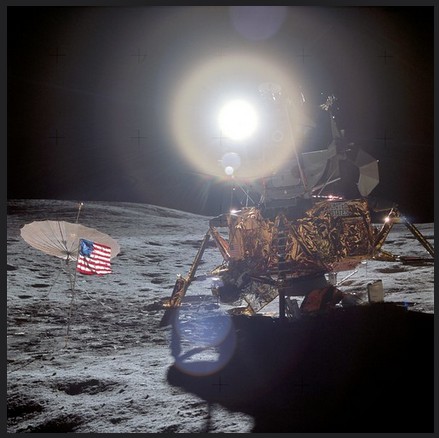 Solo che Apollo 12 aveva il sole a 7,5° sull'orizzonte ed era praticamente impossibile escluderlo almeno se si voleva inquadrare il paesaggio dalla parte del sole, e da qui sono uscite quelle foto terribili, fatte col diaframma troppo aperto e un sole (o faro) gigantesco. Errori inconcepibili anche per il più neofita dei fotografi.