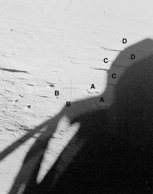 La seconda un'immagine riflessa era inevitabilmente diafana e poco luminosa e si è potuta vedere solo dove l'immagine principale era nera e dove nella sovrapposizione l'immagine riflessa aveva il terreno chiaro, in pratica sto parlando della zona C, dove l'immagine principale ha l'ombra nera mentre il riflesso ha la regolite