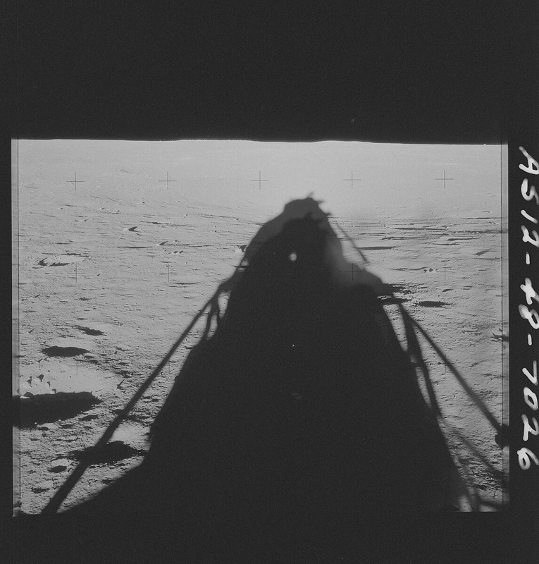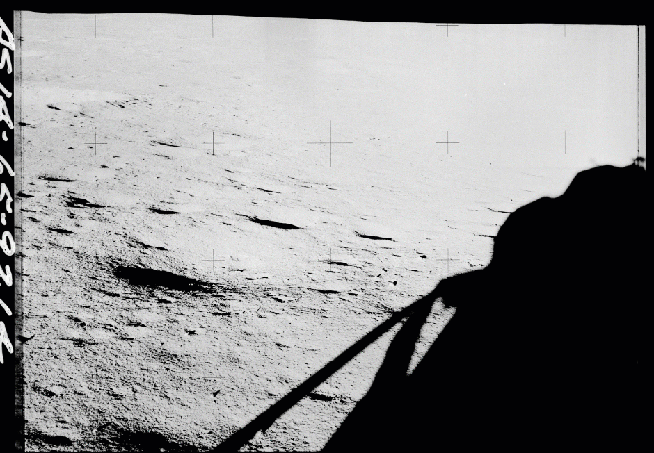 Vi metto questa gif che vi fa vedere meglio qual è l'immagine reale, che senza il riflesso avrebbe avuto l'intera ombra del Lem perfettamente nera e intorno il terreno luminoso, con perfettamente neri avrebbe avuto le ombre di sassi e crateri. Poi ho sovrapposto lentamente l'immagine riflessa e sfasata.