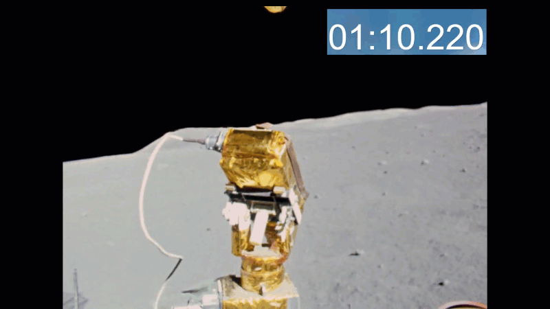 Ma se quella fonte luminosa fosse il sole, il cielo non poteva che essere azzurro, (magari oscurato in post produzione con qualche artificio) allora come è stato possibile in questa seconda gif far riflettere il nero del cielo al kapton messo in orizzontale passando da tutte le sfumature di grigio/oro e nello stesso momento far muovere il kapton controvento visto che l'aria non si poteva togliere all'aperto? Il kapton in movimento non avrebbe sventolato a pendolo come vediamo.
