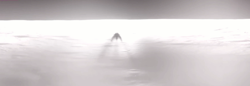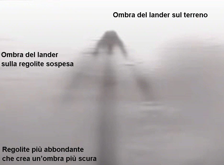 Avvicinandosi al terreno il lander sposta di più la regolite e la spinge verso l'orizzonte. Questa va a coprire parzialmente l'ombra del lander sul terreno, creando un'ombra molto sfumata sulla regolite, ombra più grande perché più vicina alla telecamera, visto che la regolite allontanandosi si solleva dal terreno per poter compiere il suo percorso parabolico.