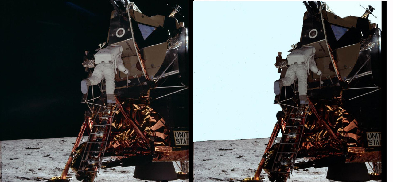 Alla foto scattata "sulla luna" aggiungi il cielo.Poi sul fatto che lui abbia aumentato la luminosità del terreno la cosa è scontata: il terreno sulla terra è sempre illuminato da due fonti, una il sole, l'atro il cielo.
