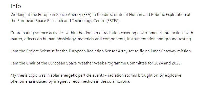 Questo è un vero esperto, non come Rasa, lavora veramente all'ESA proprio nel campo delle radiazioni.