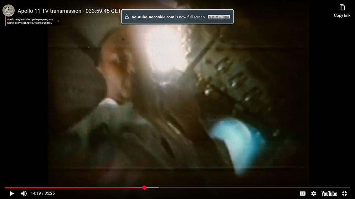 3) Ad un certo punto della ripresa qualcosa di voluminoso si frappone fra l’obiettivo e la terra. Se la telecamera fosse appoggiata al finestrino questo non potrebbe succedere. Se invece fosse dalla parte opposta della capsula, basta il braccio di Collins che si muove per bloccare temporaneamente la vista della "terra":