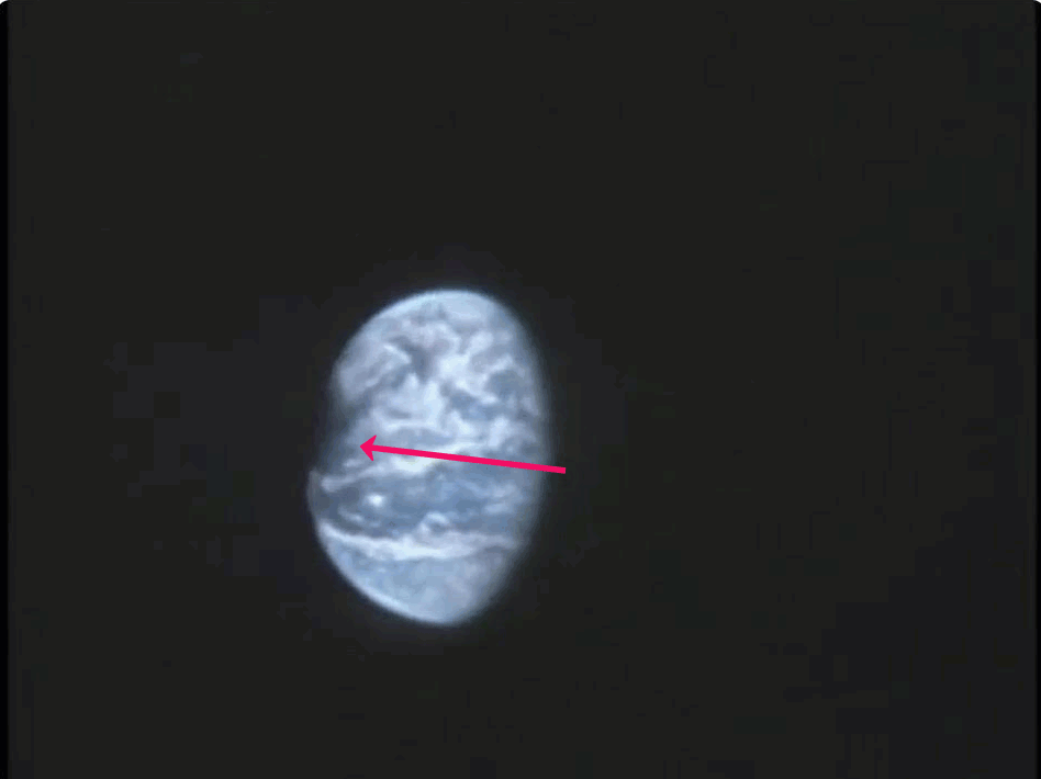 E comunque c'è questa prova che contraddice completamente l'ipotesi lucido: Dal minuto 1,33 al minuto 7,33 la Terra è rimasta costantemente inquadrata senza fare zoom o spostamenti orizzontali, eppure confrontando le due immagini si nota una piccola ma visibile rotazione. Impossibile da mimare con un lucido.