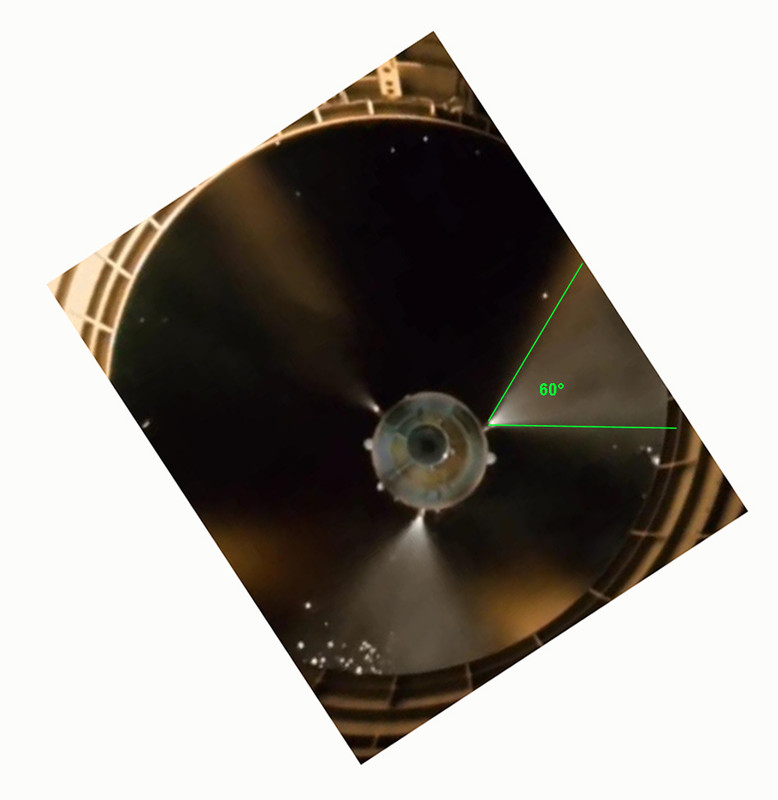 Abbiamo circa 15° per parte, per cui quei 60° della figura precedente vanno sommati ai 15° per parte di espansione dovuta alla conformazione dell'ugello e la somma fa 90°, esattamente quello che ho proposto nella mia immagine.