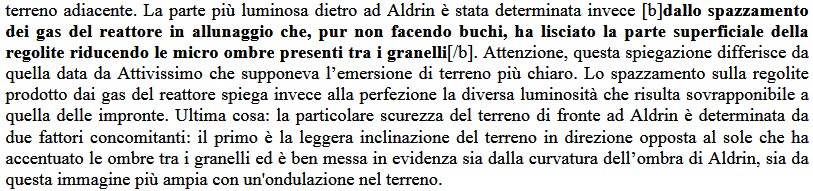 che in quel tempo, esattamente 4 giorni e 18 ore fa, lo disse in grassettoQuesta è la prova provata che sulla Luna le ombre non orizzontali non sono assolutamente nere, mentre le uniche ombre nere sono quelle che non possono ricevere luce dal terreno e sono ovviamente quelle che si formano su superfici orizzontali, prima di tutte lo stesso terreno.