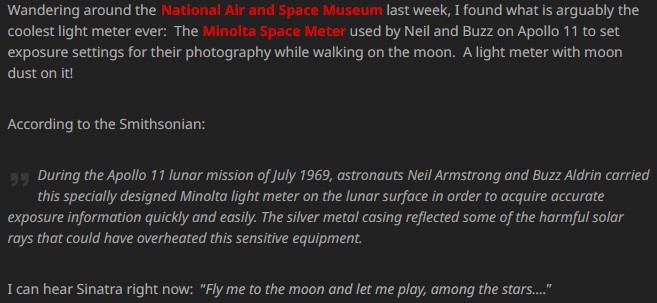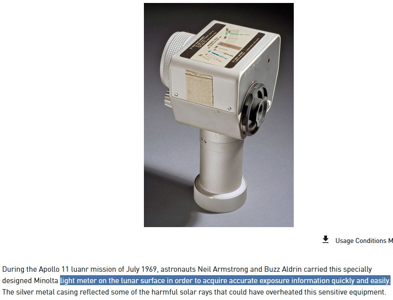 E' vero, sì, lo ammetto, so che la primissima obiezione che mi farai è che non ci sono foto o video in cui si vedono gli astronauti usare questo esposimetro sulla Luna, nonostante sia scritto pure al museo che l'hanno usato e chiunque può leggerlo.