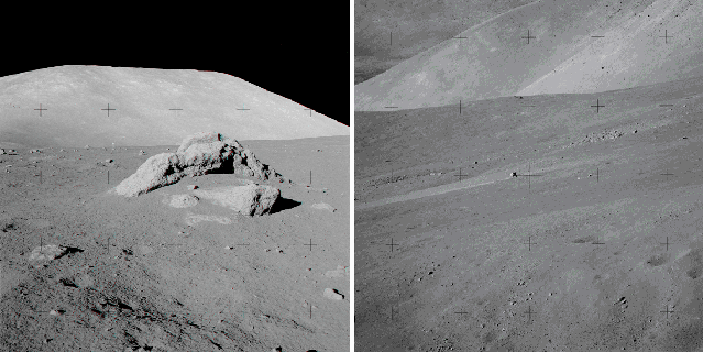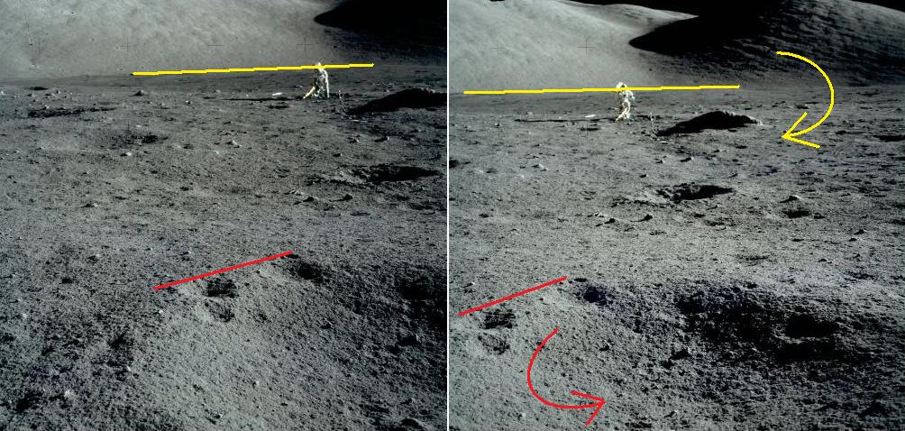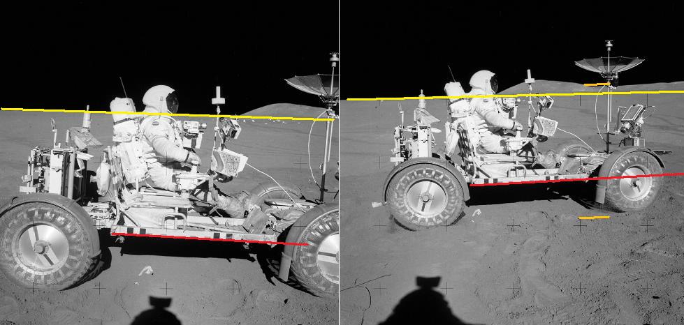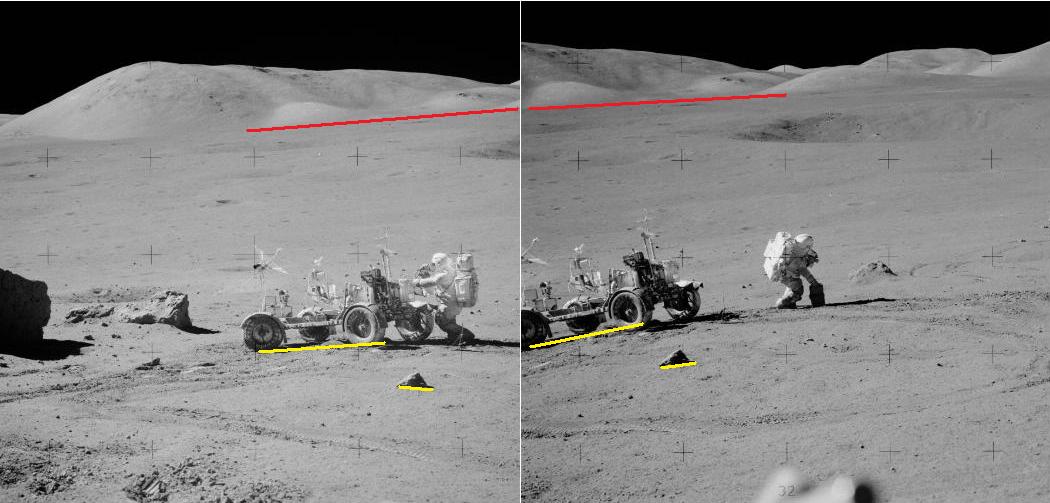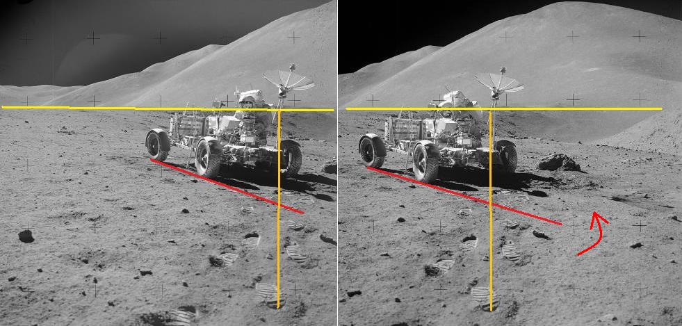 La posizione relativa di una roccia che si trova davanti al rover rispetto al rover stesso è la stessa nelle foto AS17-141-21598 e AS17-141-21599; pertanto, il fotografo non si è mosso tra le due foto e il cambio di direzione del primo piano può derivare solo da una rotazione della fotocamera attorno all'asse orizzontale e dovrebbe ruotare allo stesso modo dello sfondo.