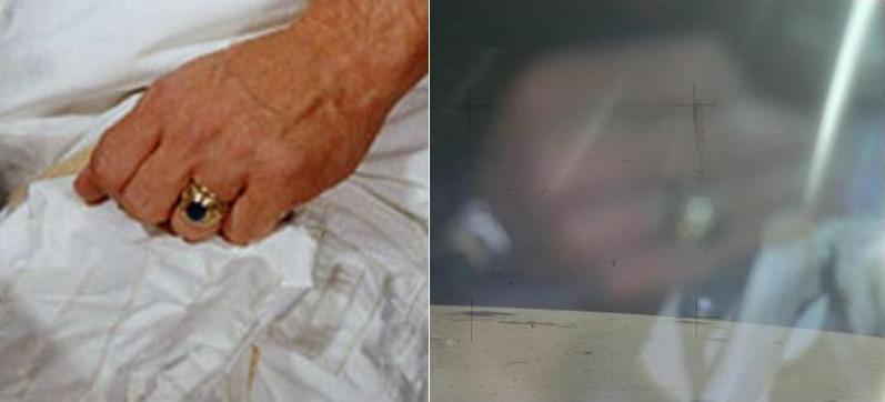Ma se osserviamo da vicino l'anello di Dave Scott e quello del fotografo riflesso, possiamo vedere che l'anello di Dave Scott ha uno zaffiro blu scuro che non vediamo sull'anello riflesso!