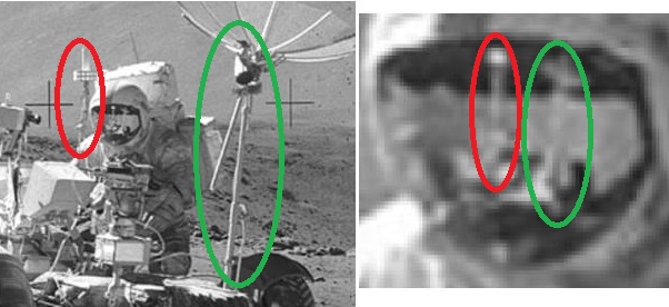 Ma quando ingrandiamo il rover nelle due foto, possiamo notare che c'è un dettaglio (che ho cerchiato in rosso) che cambia tra le due viste.