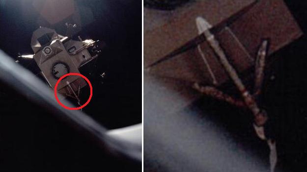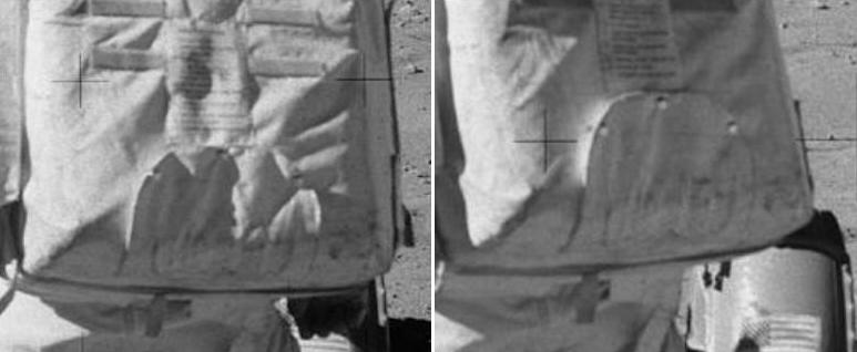 Nella visiera dell'astronauta, vediamo il riflesso delle due antenne; ma, se il riflesso dell'antenna ad alto guadagno appare normale (quella a destra, cerchiata in verde), lo stesso non vale per l'antenna a basso guadagno (quella a sinistra, cerchiata in rosso), la cui posizione sulla visiera è impossibile, data la sua posizione rispetto all'astronauta