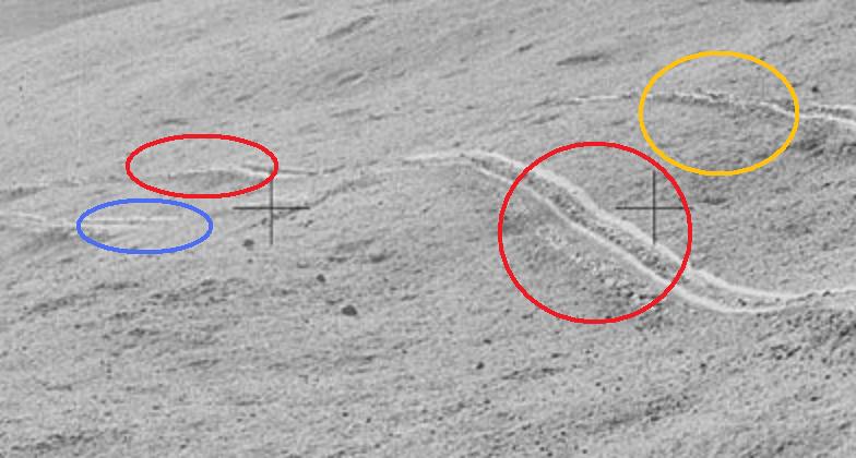 Tuttavia, possiamo osservare che le direzioni del rover e della roccia in primo piano ruotano in senso antiorario (linee gialle), mentre la direzione della collina sullo sfondo (linea rossa) ruota in senso orario; un nuovo esempio di sfondo e primo piano che ruotano in direzioni opposte, il preferito dei falsari