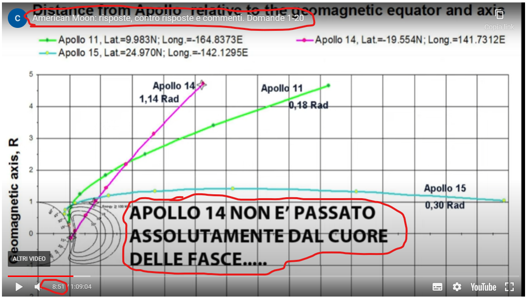 Questo è il video di Chiaro e Semplice di contro-risposta a Massimo. Come potete notare è riportata la tabella con i dati relativi alle raziazioni assorbite dagli astronauti durante Apollo 14, ben 6 volte superiori a quelle di Apollo 11. Ergo C&S non ha mai negato che A14 abbia attraversato il cuore dele fasce e che conseguentemente abbia assorbito più radioattività. Lo dice lui stesso nel video. Non mi credete? Andate a vedere il video, il minutaggio lo avete dal mio screen.