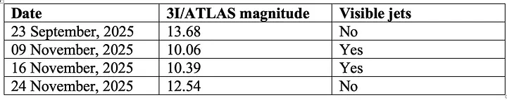 A quanto pare dall'articolo di Liena Dreams sembra che la magnitudine di 3i/ATLAS aumenti quando i getti non sono visibili e diminuisca quando i getti sono visibili: