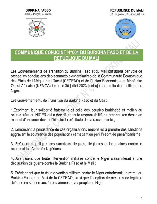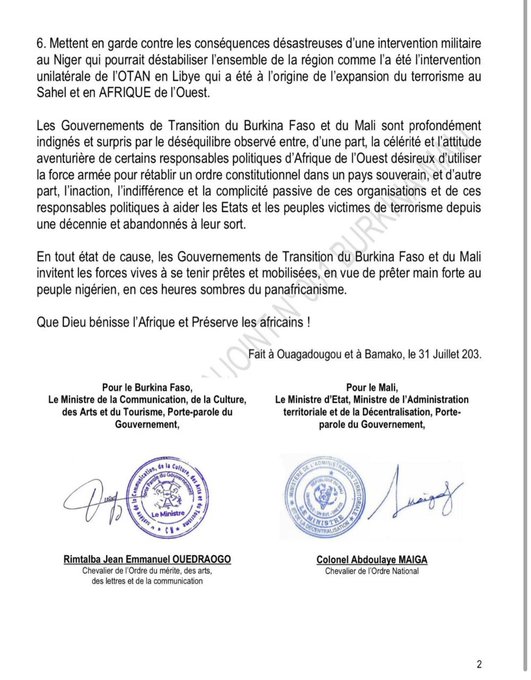 Burkina Faso e Mali annunciano la disponibilità a garantire i confini nigerini anche militarmente se necessario. L'intrusione di forze militari estere sarà considerato un atto di guerra.