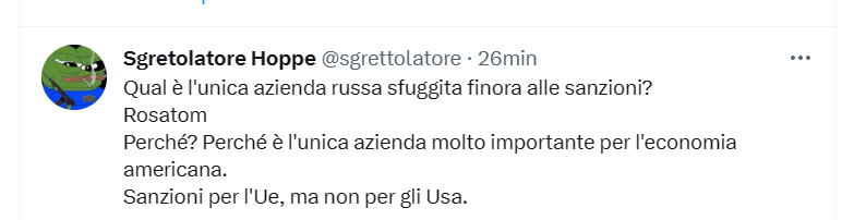 I paesi che si sono liberati di parte dei treasury bond americani lo hanno fatto in passato e continuano a farlo per necessità non per ideologia politica. Sono pochi e quasi tutti con gravi problemi economici interni. Il blocco dei capitali russi è una conseguenza della guerra in corso e agli USA poco importa se la Russia si indispettisce. Degli altri stati, ai quali potrebbe non essere un buon biglietto da visita, convieni con me che la loro economia è sorretta proprio da scambi commerciali con l'occidente? E l'occidente, di fatto, è legato indissolubilmente agli USA.