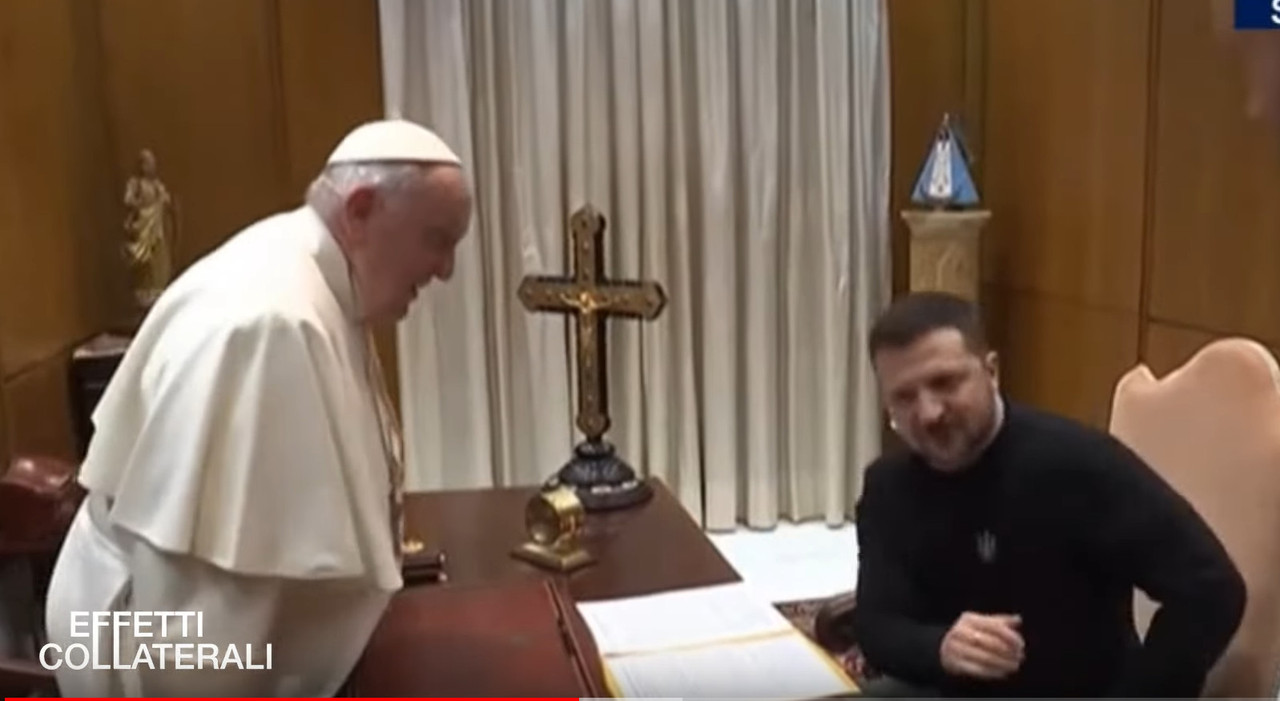 Già il simbolismo della contrapposizione stridente, iconica, tra il regalo del Papa (un rametto di ulivo di bronzo) e quello di Zelensky, (una decorazione su un giubbotto militare), basteranno alla Storia per definire figurativamente questo tragico evento.