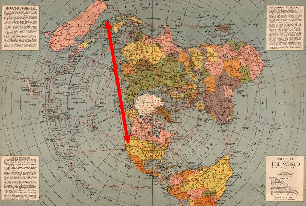 La domanda infatti è questa: se la terra fosse piatta, la distanza fra Australia e America del Sud sarebbe tale da impedire un qualunque volo diretto fra loro. Come vediamo dalla cartina più sotto, “aprendo” la terra da sotto, come se fosse un arancio appiattito, Australia e Argentina vengono a trovarsi ad una distanza impossibile da coprire con gli attuali aerei di linea (ca. 30.000 Km almeno, contro un range massimo di volo di circa 17.000).