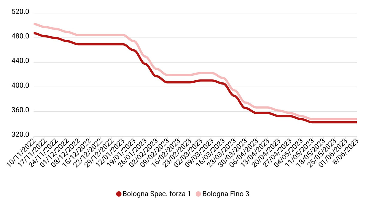 Qui, il primo grafico che ho trovato, sul prezzo all'ingrosso del grano da novembre 2022.