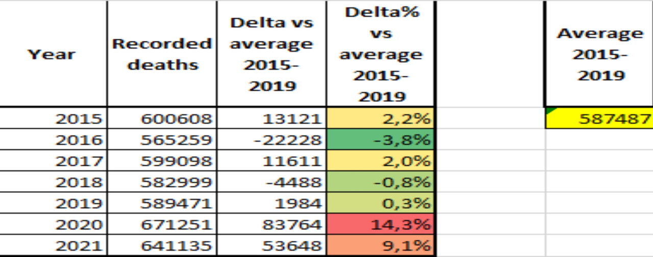 Nella foto allegata l'evoluzione dei decessi in Italia tra 2015 e 2021, con il picco evidente di 2020 e 2021 ben al di sopra della media del quinquennio 2015-2019.