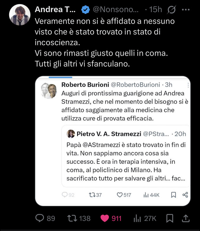 Nota aggiornata al 5 marzo 2026: Poche ore/giorni fa (tra il 3 e il 4 marzo), Andrea Stramezzi è stato trovato in fin di vita nella sua abitazione, ricoverato in coma al Policlinico di Milano in terapia intensiva (intubato, febbre alta, cause ancora ignote secondo il figlio Pietro). Molti nei suoi ambienti parlano di "preghiere" e sospetti (attentato? per le sue ricerche su cancro/terapie alternative o posizioni controcorrente), ma non ci sono conferme ufficiali. Questo ha ovviamente bloccato o reso impossibile la sua partecipazione all'incontro con Vannacci previsto per il 7 marzo.