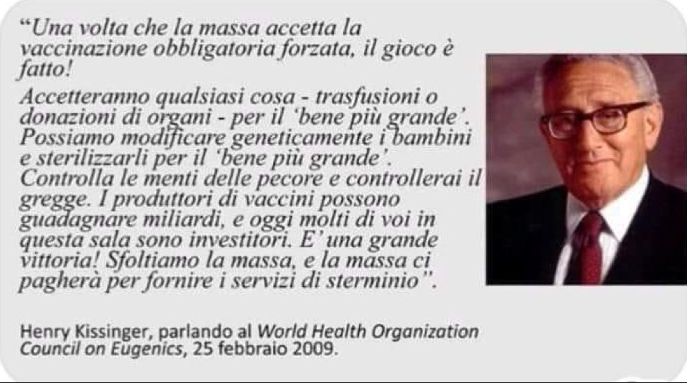 Poi quando il pecorame noterà di iniziare a morire come le mosche e che non ci saranno risarcimenti perché "noi non vi abbiamo mica obbligato" poi vedremo di cosa avranno maggiore paura, tra la morte vera e quella raccontata dal rettilone in conferenza stampa.