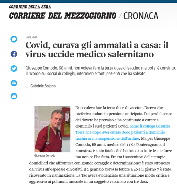 Povero dott.Trinca anche lui ha pagato per dire la verità. A pensar male si fa peccato ma ci si azzecca. Ora sono molte le persone attive contro questa criminale narrazione che muoiono all’improvviso, spero che sia disposta autopsia in modo accurato per cercare la verità. RIP povero grande dottore.