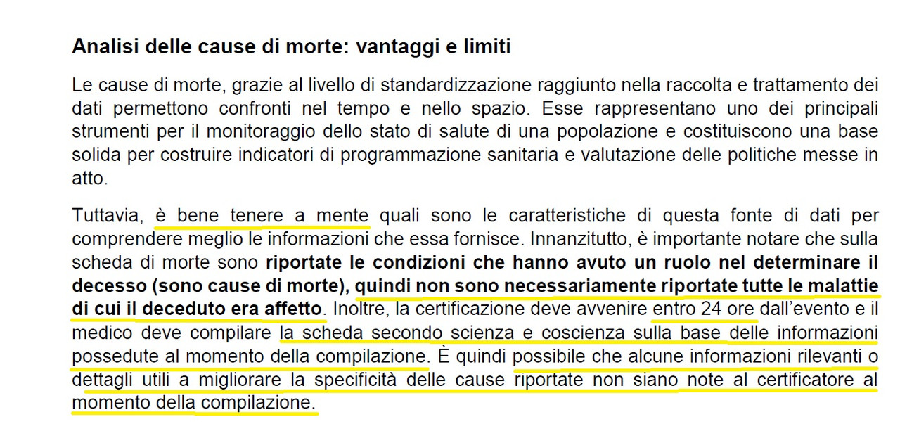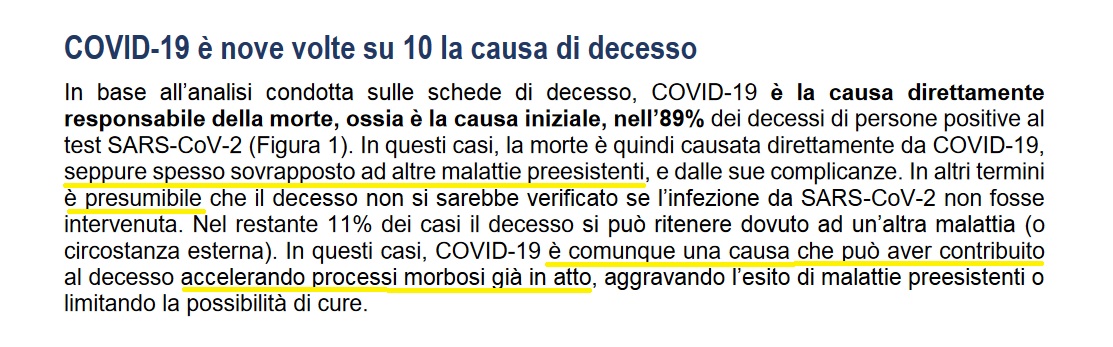 "In base all’analisi condotta sulle schede di decesso, COVID-19 è la causa direttamente responsabile della morte, ossia è la causa iniziale, nell’89% dei decessi di persone positive al test SARS-CoV-2 (Figura 1). In questi casi, la morte è quindi causata direttamente da COVID-19, seppure spesso sovrapposto ad altre malattie preesistenti, e dalle sue complicanze. In altri termini è presumibile che il decesso non si sarebbe verificato se l’infezione da SARS-CoV-2 non fosse intervenuta(1). Nel restante 11% dei casi il decesso si può ritenere dovuto ad un’altra malattia (o circostanza esterna). In questi casi, COVID-19 è comunque una causa che può aver contribuito al decesso accelerando processi morbosi già in atto, aggravando l’esito di malattie preesistenti o limitando la possibilità di cure(2)."