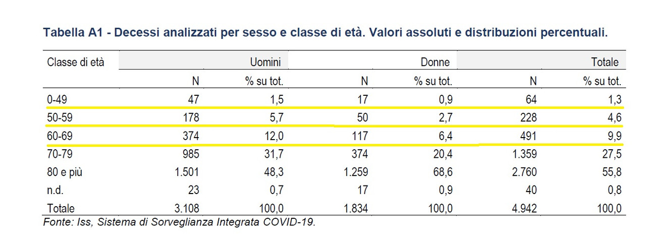 Il numero di deceduti tra 60-69 anni che è stato analizzato è pari a 491. Gli ultraottantenni sono 2760. 5 volte tanto. La selezione del campione su base arbitraria non ci permette di stabilire esattamente la percentuale che ha come causa iniziale covid19, dato che si basa sul 15,6 % del campione totale. Inoltre non è specificato il numero di concause che hanno contribuito alla morte, solo la causa iniziale.