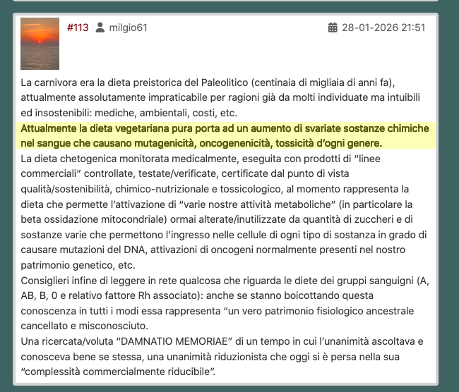 Negli ultimi anni, nonostante tutta l'attività fisica, mi alzavo la mattina e mi domandavo che dolorino avrei avuto, senza nessuna ragione, allora mi sono imbattuto in un canale telegram che tratta l'argomento dieta chetogenica, low carb e carnivora. Ho deciso di provare e ho eliminato pasta e pane. Ho ripreso a mangiare tutti i giorni carne, burro, 4 uova al giorno, formaggio....
