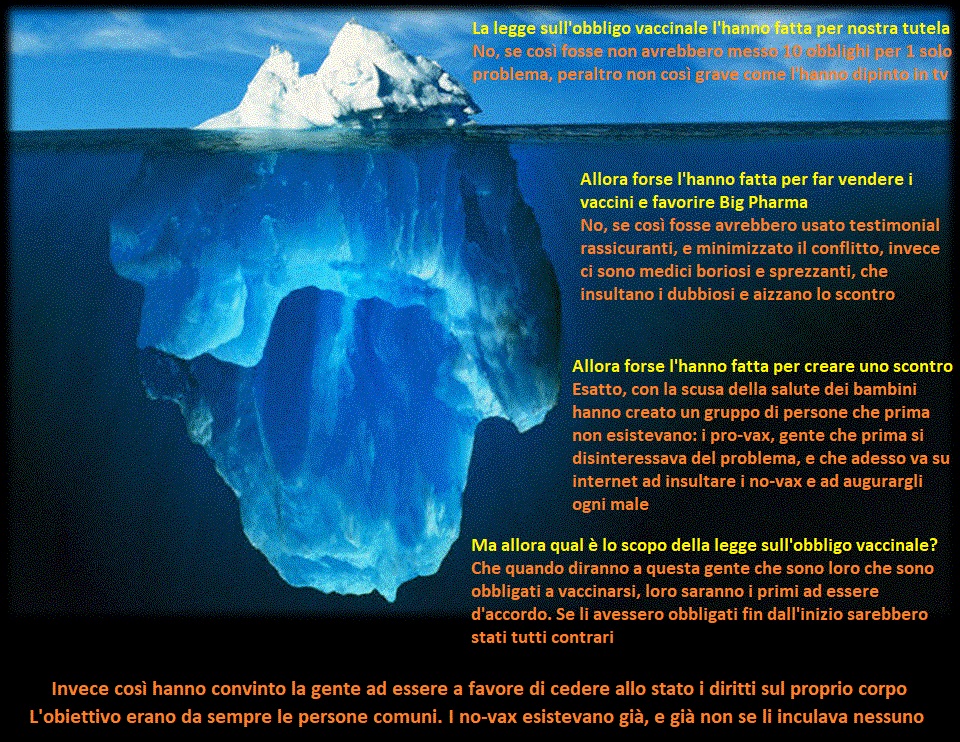 Ti svelo un segreto, a te che sostieni l'obbligo vaccinale: il bersaglio di questa strategia, di tutta questa strategia, dalle epidemie con morti inventati fino dall'obbligo, dalla radiazione dei medici eretici alle esclusioni dagli asili, dai sindaci che invocano roghi a gelatai che vietano accessi, dai dottori arroganti che insultano genitori e pazienti dubbiosi fino ai NAS che indagano le autocertificazioni delle mamme - il bersaglio di tutto ciò non sono i no-vax. Dei no-vax non importa niente a nessuno: non contano nulla né commercialmente né politicamente né socialmente e non minacciano in alcun modo la salute pubblica. Una percentuale di cittadini che rifiutano di adeguarsi è del tutto fisiologica, in ogni tipo di società. Ci sono sempre stati, ci saranno sempre. Te li hanno sbandierati davanti al naso di proposito, come il drappo rosso davanti al toro. Non è a loro che puntano: il bersaglio sei tu.