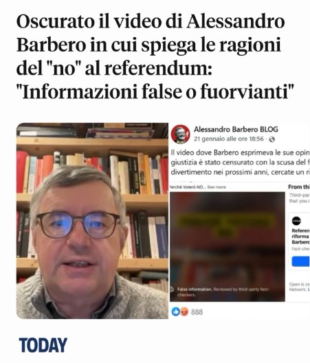 ...che è durato quanto il proverbiale “gatto in autostrada”: è bastato infatti che il Professor Barbero si sia espresso pubblicamente su Facebook con un’analisi riguardo le ragioni del No al referendum sulla separazione delle carriere dei magistrati, che il gruppo di fact-checking Open, nella persona di David Puente, si arrogasse il diritto unilaterale di oscurare tale video da Facebook!