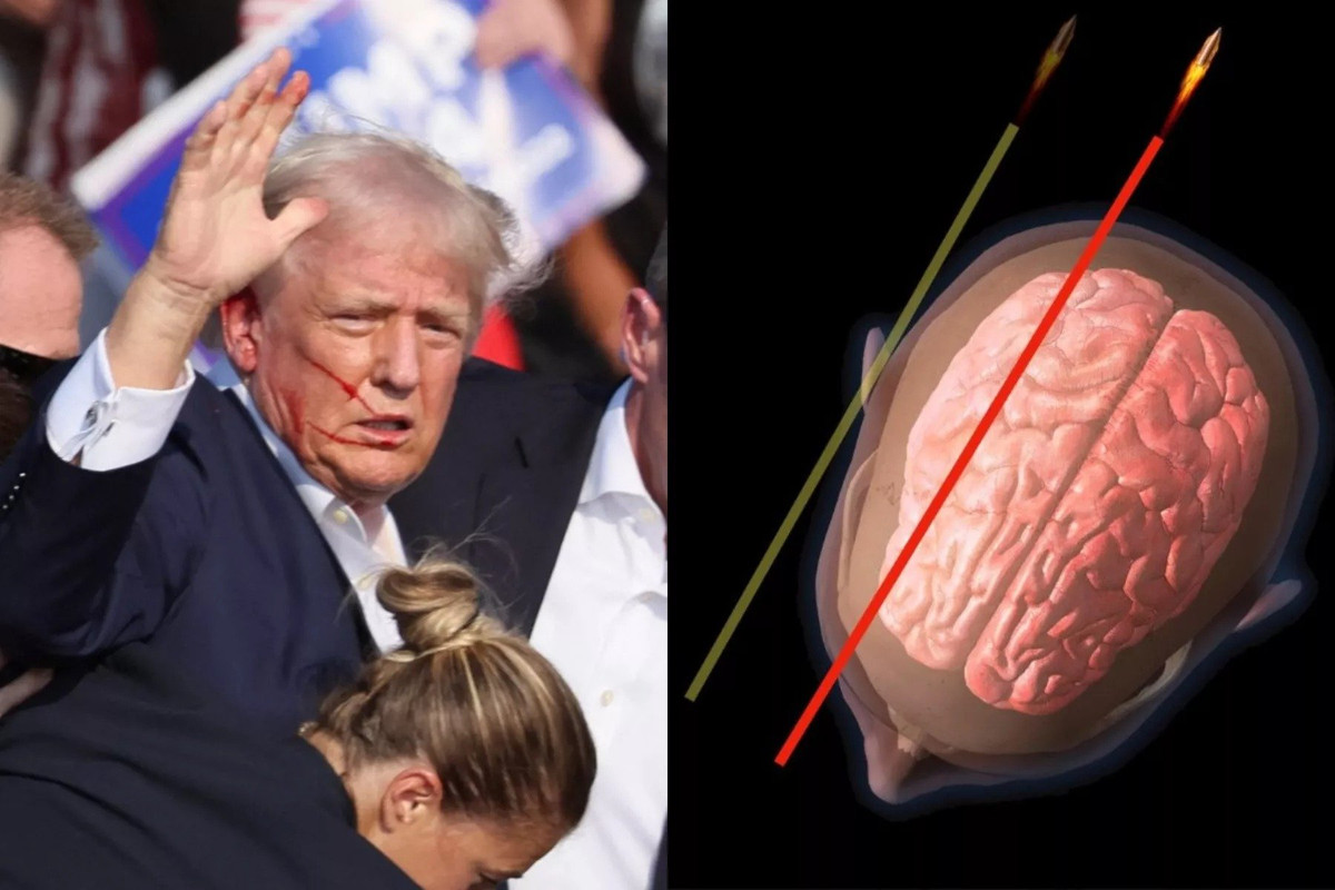 striscia rossa: traiettoria proiettile se Trump non avesse all'ultimo istante girato la testa verso il tabellone.